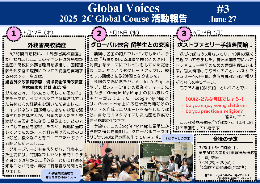 ① 外務省高校講座「外交って何しているの?」 ② グローバル総合 Google My Mapsの活用 ③ ホストファミリー手続き