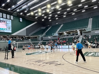 放課後は、大学女子バレーボールの試合を観戦!PSUは、大学の最上位リーグで活躍しており、迫力ある試合と立派な会場に、生徒たちは大きな声援を送りながら大興奮でした。試合中には会場のスクリーンに生徒が映される場面も!
