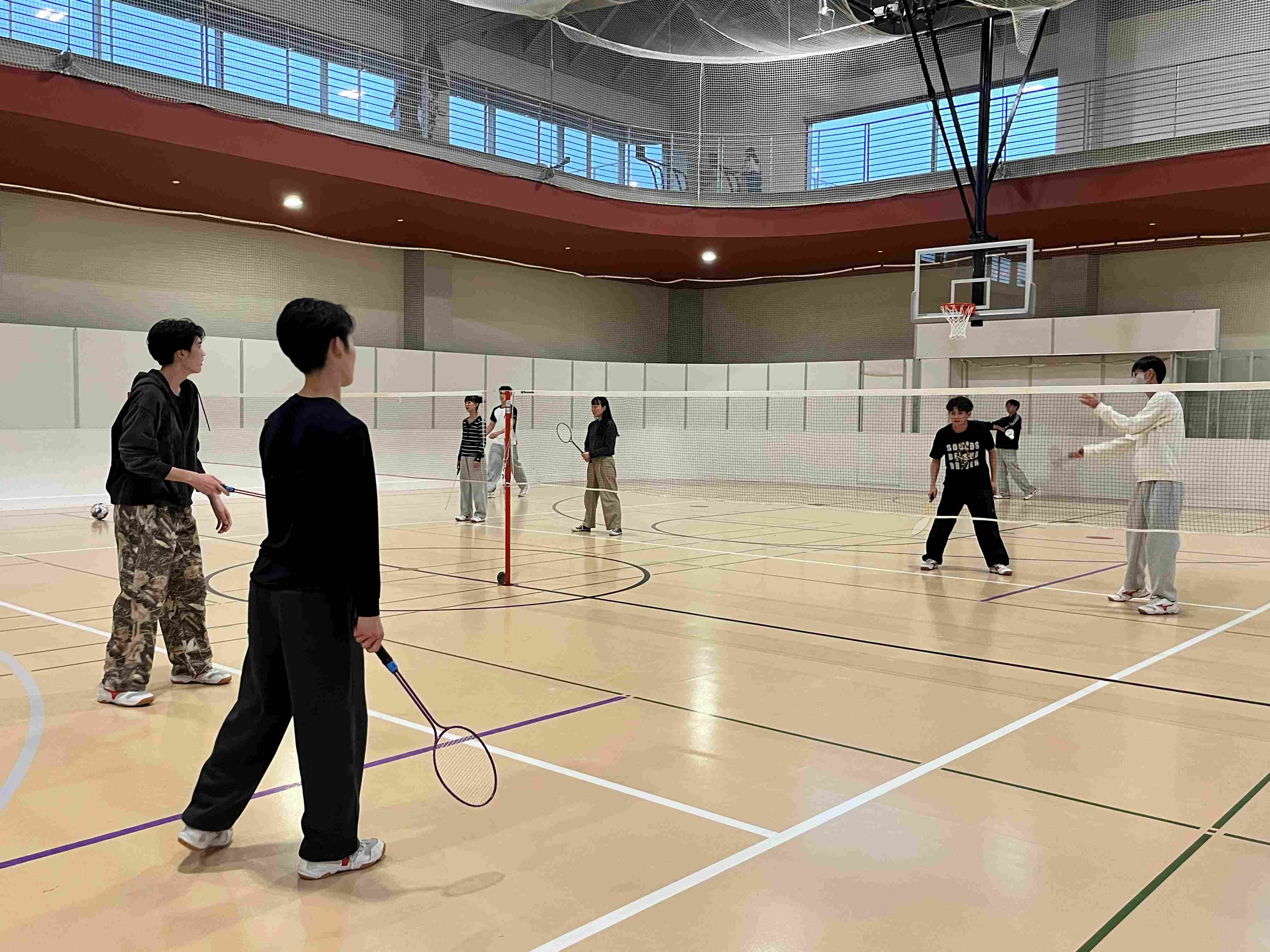 午後は、プログラムのサポーターの方々や大学生との英会話タイムからスタート。この3週間の出来事をはじめ、「なぜポートランドで暮らしているのか」「なぜこの大学を選んだのかなど」など、人生の先輩方と話をしながら、ゲームも交えて楽しいひとときを過ごしました。その後は、大学にある体育館へ。体育館と言っても、一般的な学校の体育館とは違い、本格的なトレーニング機器やロッククライミング施設、プールまであり、学生のみならず地域の方々の健康づくりにも役立っています。そんな施設をお借りし、様々なスポーツやトレーニングを楽しみました。その場にいたポートランド州立大学の学生とバスケットボールをする様子も!こちらで出会う人は誰もがフレンドリーです。