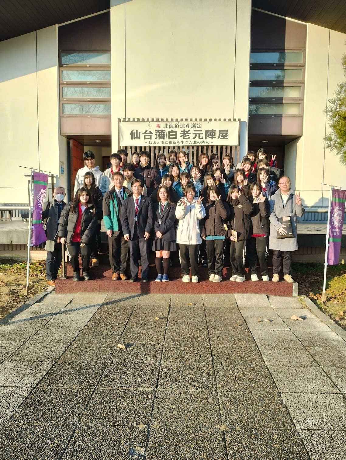 2025.11.17在校生の皆さんへ ALネットワーク事業(旧WWL事業) 白老東高等学校との協働の学びの機会実施イベント 13日 30名の生徒が「ALネットワーク事業 探究 歴史とSDGsをつなぐ」に参加し、白老町で白老東高校の生徒さんと交流しながら、アイヌ文化を学び、北方警備史を学びました。白老東高校のボランティアガイドの皆さん、素晴らしいガイドでした。ありがとうございました。