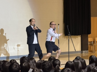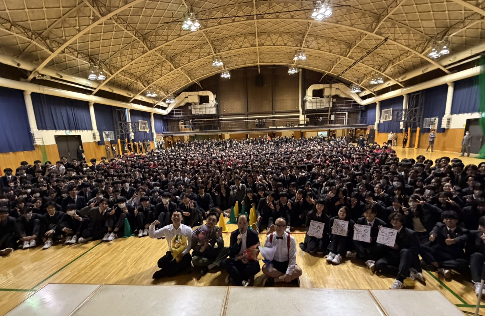 一昨年度から開催され、今年で3年目となった著名人講話会。ゲストは登場まで誰かわからないサプライズです。今年のゲストはお笑い芸人のコイオドリさんと、同じくお笑い芸人のトレンディエンジェルさんの2組でした。コイオドリのハギさんは、本校の卒業生です。