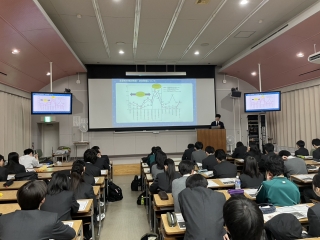2025.12.24特進コース ベネッセによる進路講演会が開かれました特進 冬期休業日が始まる本日12月24日より3日間、冬期講習が行われます。本日はベネッセコーポレーション畑林大樹さんにお越しいただき、1,2年生を対象に進路講演会をしていただきました。勉強に対する考え方や、国公立大学の魅力、現在の受験について親しみやすくわかりやすい話でモチベーションアップや勉強の向かい方の成長に繋がりました。合言葉は「コツコツが勝つコツ」