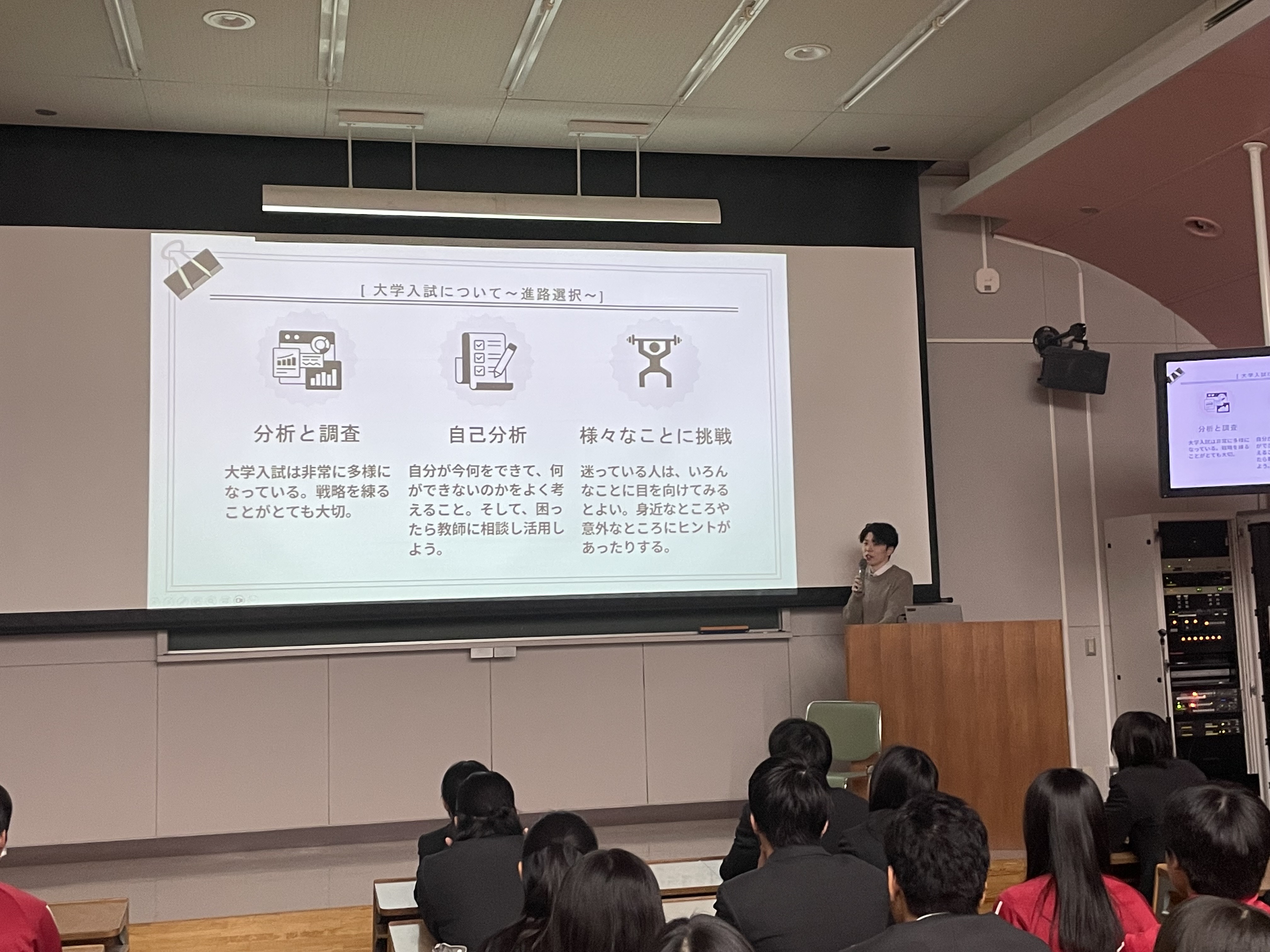 冬期講習の最終日、本校の卒業生である、「北海道大学 河野悠人さん(令和4卒)、北海道教育大学 森大地さん(令和6卒)、千歳科学技術大学 南川昊翔さん(令和7卒)」が来校し、講演をしてもらいました。