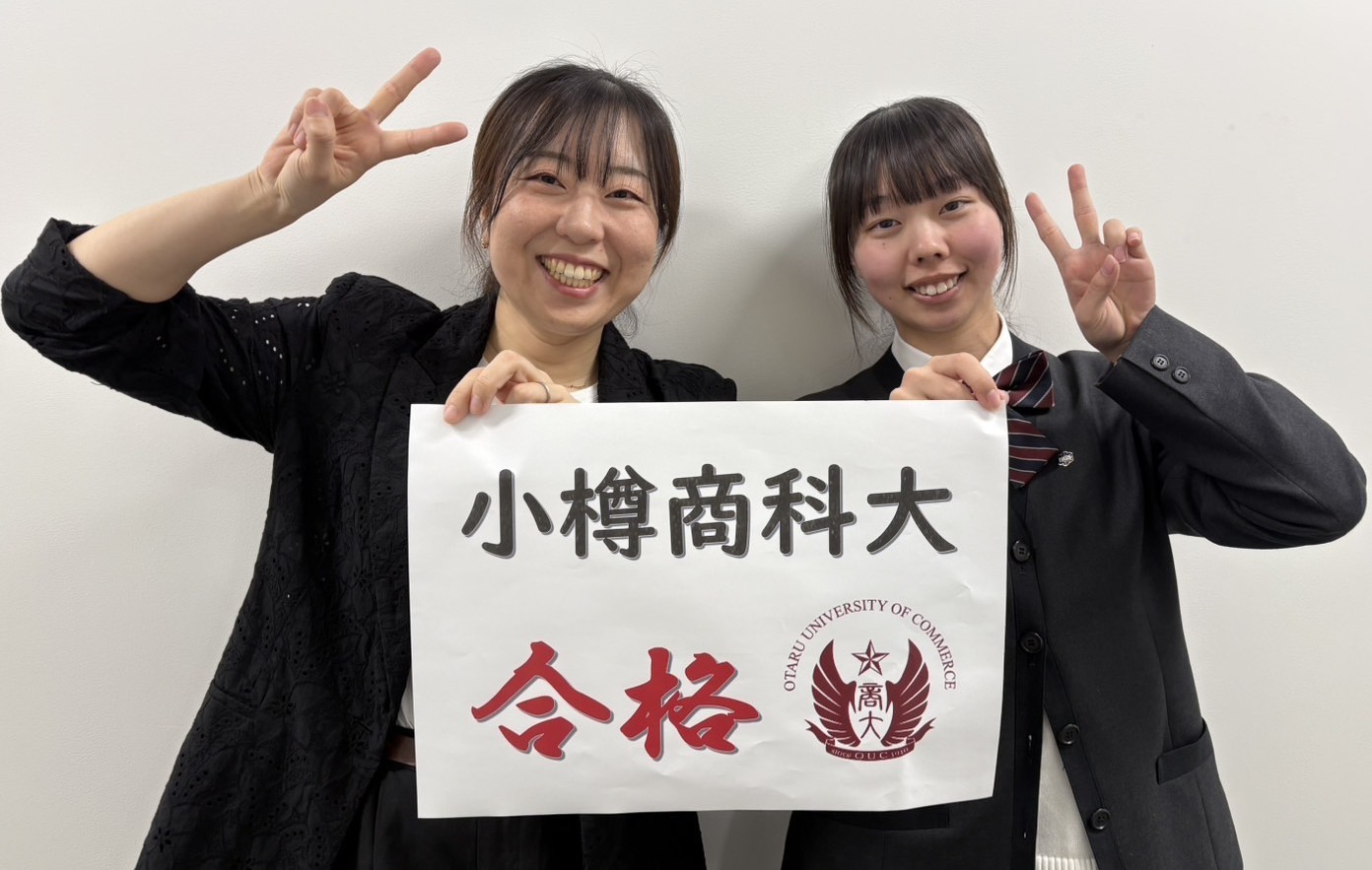 2026.03.09特進コース 学校推薦型選抜で小樽商科大、室工大合格!特進 共通テストを利用した学校推薦型選抜で小樽商科大学と室蘭工業大学に合格者が出ました。指導にあたった先生と記念撮影です。合格おめでとう!