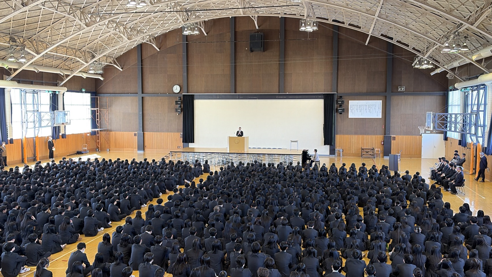 2026.04.08 始業式・着任式を行いましたイベント 本日、始業式および着任式が行われました。2・3年生が体育館に集まり、校長先生のお話のほか、全国大会に出場した少林寺拳法部の表彰、新たに着任された先生方の紹介などが行われました。生徒たちは新しいクラスでのスタートとなり、期待と緊張が入り混じった表情を見せていました。これから始まる学校生活が実り多いものとなるよう、充実した一年を過ごしてほしいと思います。